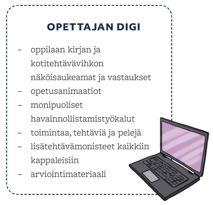 Digimateriaalissa opettajalla on käytettävissään kaikki, mitä oppitunnin tueksi tarvitaan: näköiskirja vastauksineen, opetusanimaatiot, monipuoliset havainnollistamistyökalut sekä yhteistä tekemistä oppitunnille. Kaikki mitä oppaan sivuilta löytyy, on myös digimateriaalissa helposti käytettävissä!