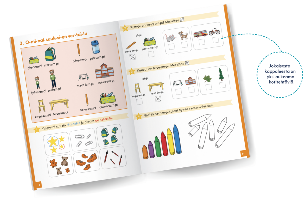 Oppilaan vuosiluokkakohtaiseen pakettiin kuuluu myös erillinen kotitehtävävihko jokaiseen oppilaan kirjaan. Vihkossa on yhden aukeaman verran oppilaan kirjasta tuttuja tehtävätyyppejä jokaista kappaletta kohden. Myös oppilaan kirjan opetusruutu löytyy vihkosta, joten kotitehtävien tekeminen ilman kirjan kotiin kuljettamista on helppoa. Halutessaan opettaja voi tietenkin antaa kotitehtävät myös kirjasta.